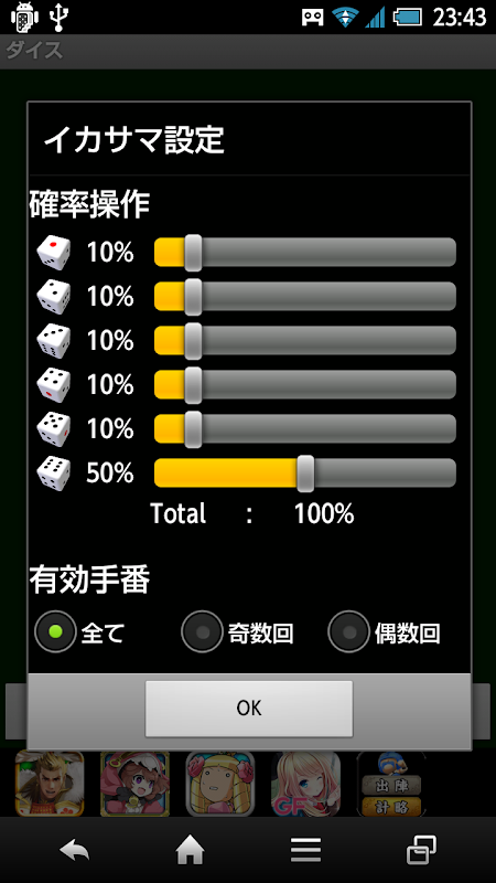It is a dice app that can be manipulated by the probability that out of each outcome.