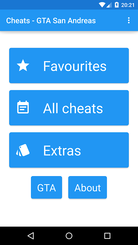 In this app you will find all CHEATS and codes for GTA San Andreas for Playstation, Xbox and PC & Mac. You will also find one button to save your cheats in favourite, and later you will be able to see it very fast.