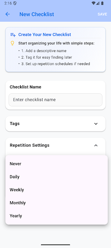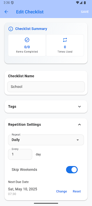 سمارٹ تکرار: روزانہ، ہفتہ وار، ماہانہ، سالانہ، یا کبھی نہیں دہرانے کے لیے چیک لسٹ سیٹ کریں۔ عادات، بار بار چلنے والے کاموں، یا ان فہرستوں کو پیک کرنے کے لیے جو آپ اکثر استعمال کرتے ہیں۔