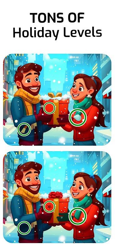 • فرق تلاش کریں: ہر منظر کو غور سے دیکھیں اور چھٹیوں کی دو تصویروں کے درمیان 10 فرق تلاش کریں۔ ہر تصویر چھپی ہوئی تفصیلات سے بھری ہوئی ہے جو کرسمس کے موسم کو زندہ کرتی ہے۔