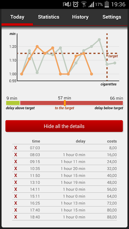 Do you want to reduce the number of cigarettes? Or quit smoking completely? Or just track the amount of cigarettes during the day? Or the costs of your passion? Then this application will be big help for you.