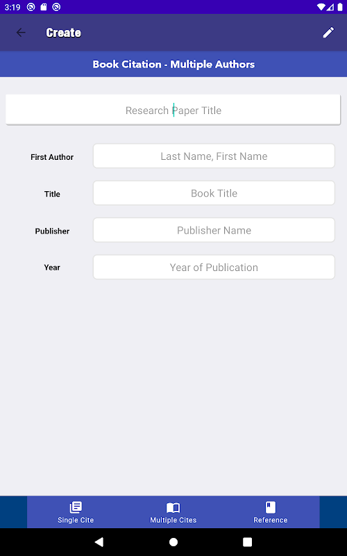 Cited is the easiest citation creation app. Simply select your paper format and your template, enter the information, and press create. Now with a section to create and save multiple citations.
