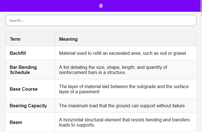 واضح تعریفیں: سول انجینئرنگ کی ہر اصطلاح آپ کو سول انجینئرنگ کی اصطلاحات کو مؤثر طریقے سے سمجھنے اور لاگو کرنے میں مدد کے لیے واضح، جامع تعریفیں فراہم کرتی ہے۔