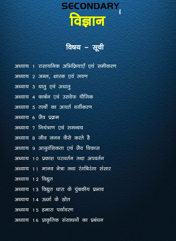 اس ایپ میں ہندی میڈیم میں دس کلاس سائنس کے درج ذیل ابواب ہیں