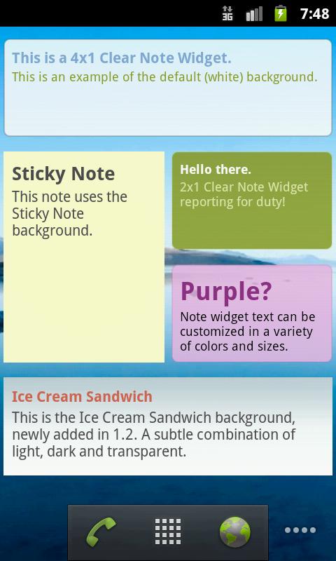 Keep your notes and reminders handy on your home screen. Clear Note Widget is a completely transparent Android sticky note app that lets you add a variety of note widgets. Great for shopping and to-do lists, general reminders, and personal quotes. Supports encryption/password-protected notes, note sending, multiple note widget background styles, and multiple widget sizes!