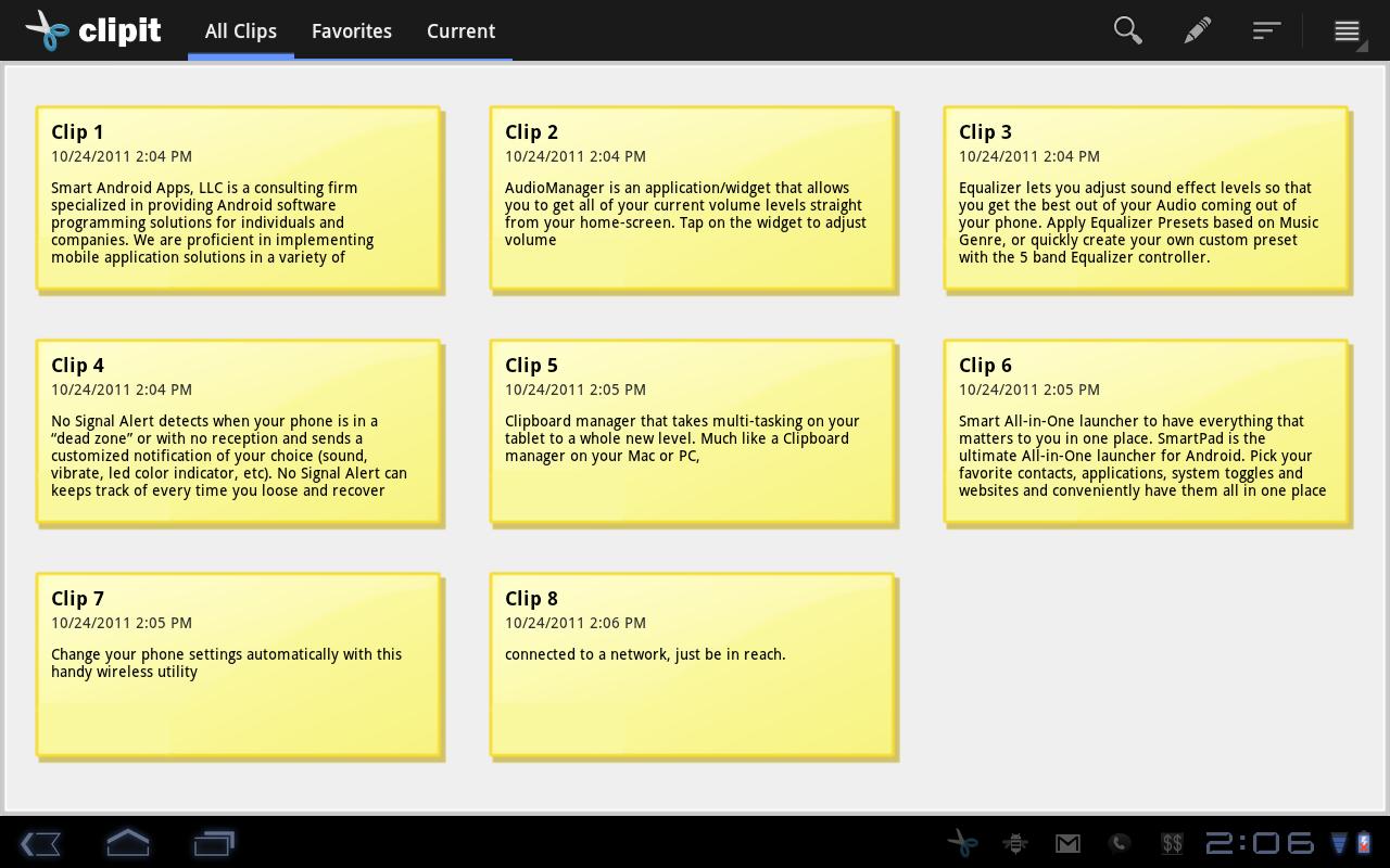 Much like a Clipboard manager on your Mac or PC, ClipIT allows you to copy and manage an unlimited number of items to your clipboard. You can copy, search, star, manage, share, and easily switch between clips all from our easy to use clipboard console or directly through the home-screen widget.
