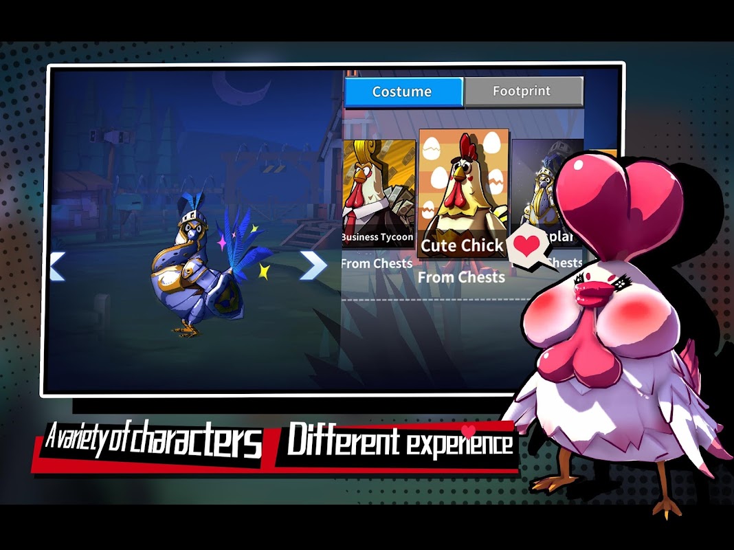 The current roster includes some ten characters: the fried chicken shop owner Leon, the lovely little girl Rita, the maid Kelly, Egg-a-fowl, Time Fowl and more! There are also dozens of fancy skins for you to unlock and use, each one transforming you into a dazzling peacock!