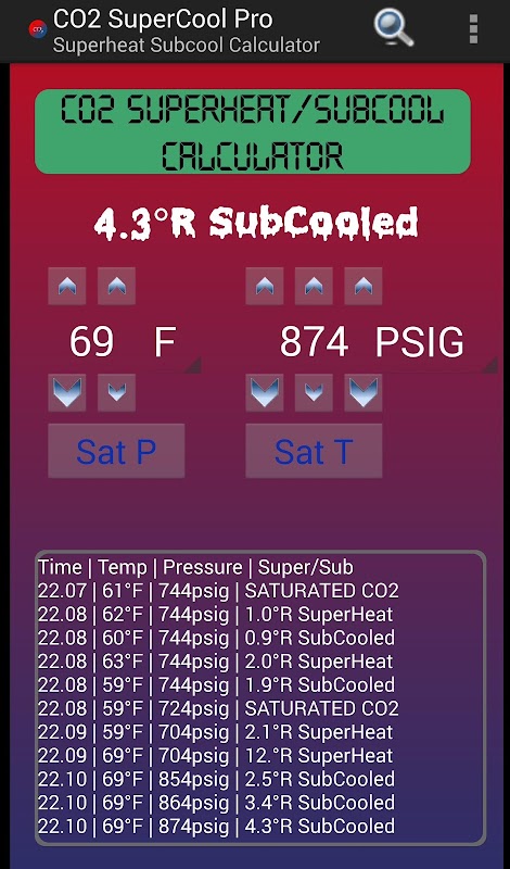 ☺ Input the temperature and pressure of CO2 to calculate if it is Subcooled, Saturated, or Superheat! This PRO Version unlocks calculations for temperature ranges of -40°F/C to CO2 critical temperature of 87°F(31°C) and pressure ranges of 130psig(9barg) to 1056psig(72.8barg).