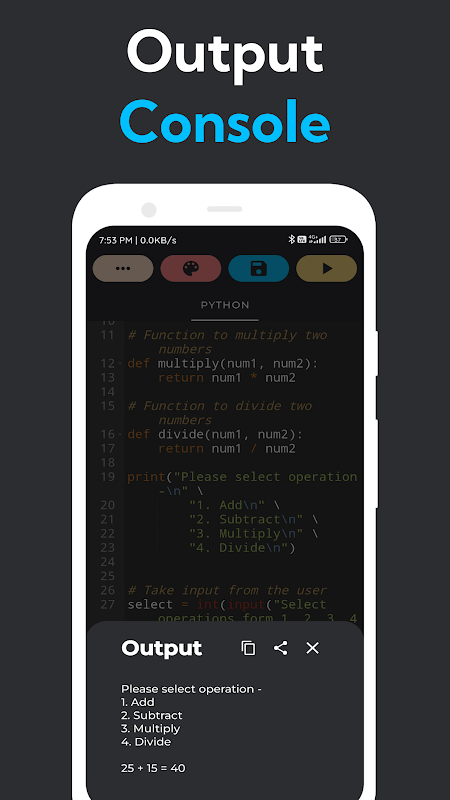کوڈ ایڈیٹر کے ساتھ، آپ کو اپنی انگلیوں پر کالعدم کرنے، دوبارہ کرنے، سب کو منتخب کرنے، سب کو صاف کرنے، کٹ، کاپی اور پیسٹ کرنے کی طاقت حاصل ہے۔ اپنے کوڈ اور یہاں تک کہ آؤٹ پٹ کا اشتراک کرکے آسانی کے ساتھ تعاون کریں۔ منظم اور موثر رہیں کیونکہ آپ آسانی سے اپنے پروجیکٹس کو منظم اور منظم کرتے ہیں۔