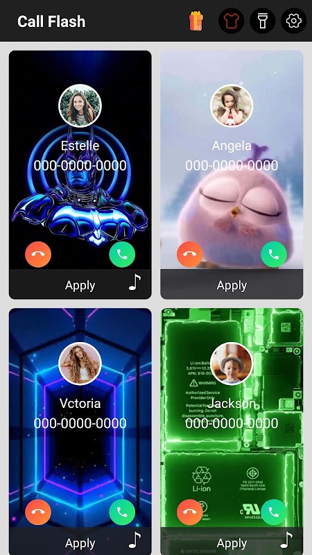 Call آپ کی کال اسکرین کو کسٹمائز کرنے کیلئے 30+ رنگین فلیش تھیمز پر مشتمل ہے۔