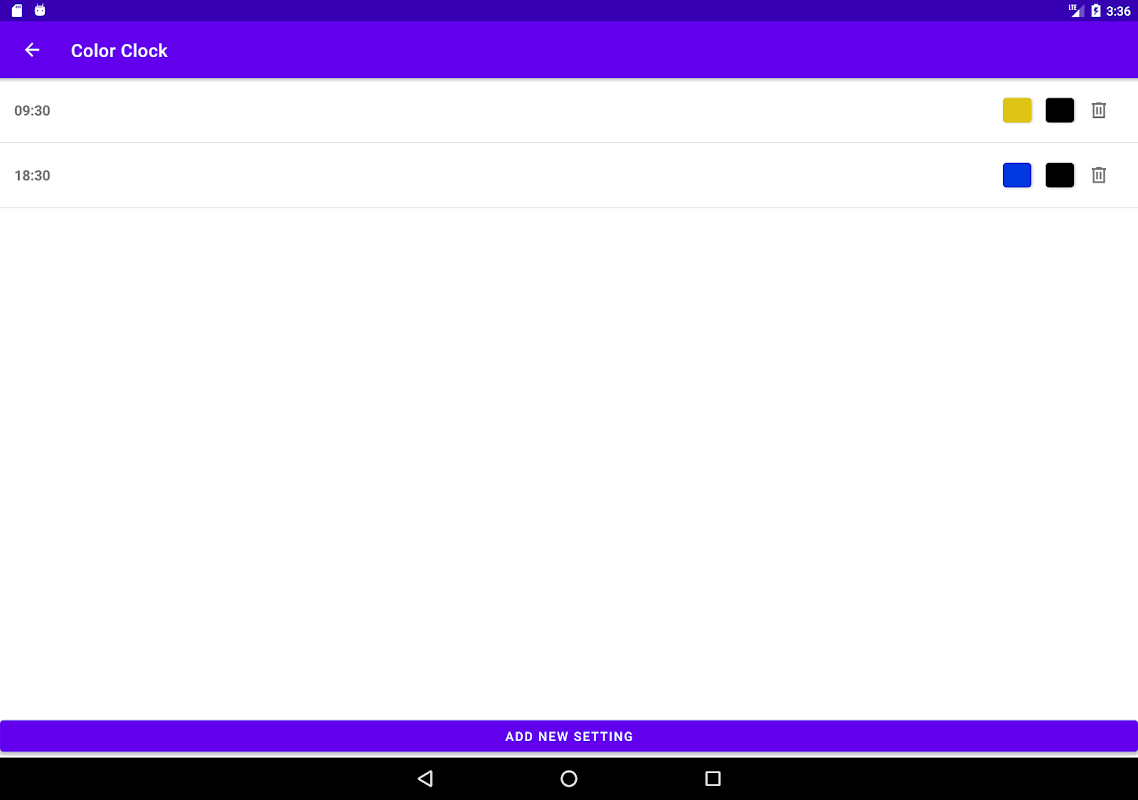 بچوں یا کسی ایسے شخص کے لیے جو وقت کا تصور کرنا چاہتے ہیں۔ سادہ ایپ جو مقررہ اوقات میں رنگ تبدیل کرنے کی اجازت دیتی ہے۔ چلتے وقت اسکرین فعال رہتی ہے، اس لیے نائٹ اسٹینڈ گھڑی کے طور پر استعمال کرنے کے لیے بہترین ہے۔ کسی اجازت کی ضرورت نہیں، کم بجلی کی کھپت اور واپس Android 4.1 سے مطابقت رکھتا ہے تاکہ آپ کے بچے کی نائٹ لائٹ گھڑی میں پرانے فون کو اپسائیکل کر سکیں۔