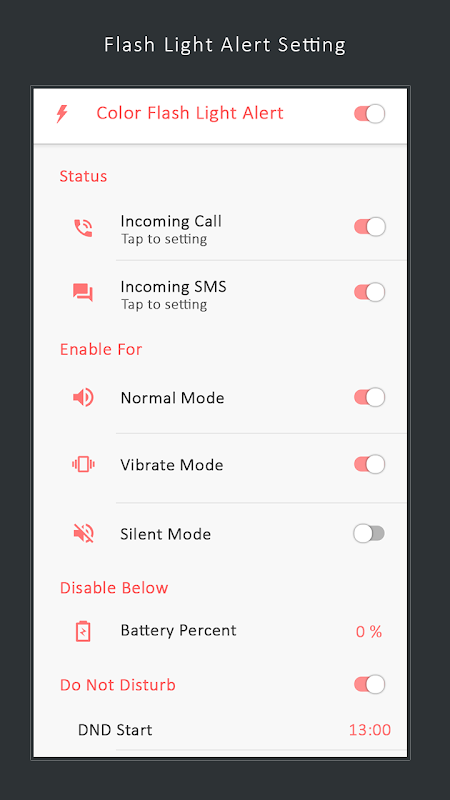 # color flashlight Notification Color app can be set to work in different phone modes.
