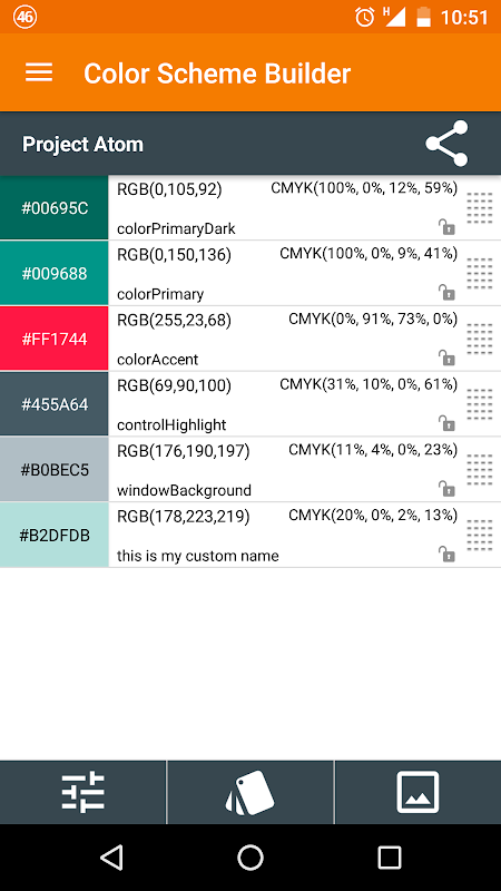 • Share your Color Schemes as TEXT, HTML or Android color resource format.