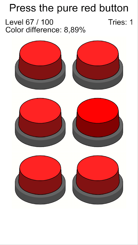 ایک رنگ منتخب کریں (سرخ/سبز/نیلے)۔ آپ کو چھ بٹن نظر آئیں گے۔ آپ کا کام سب سے زیادہ شدید رنگ کے ساتھ ایک کو منتخب کرنے کے لئے ہے. جیسے جیسے آپ لیولز سے گزرتے ہیں، رنگ کا فرق اس حد تک کم ہو جاتا ہے جہاں آپ یہ نہیں بتا سکتے کہ کون سا بٹن صحیح ہے۔ ہر سطح پر آپ ایک اضافی موقع کے ساتھ شروع کرتے ہیں، لہذا صرف دوسری ناکامی (مسلسل) کے نتیجے میں گیم ختم ہو جائے گی۔