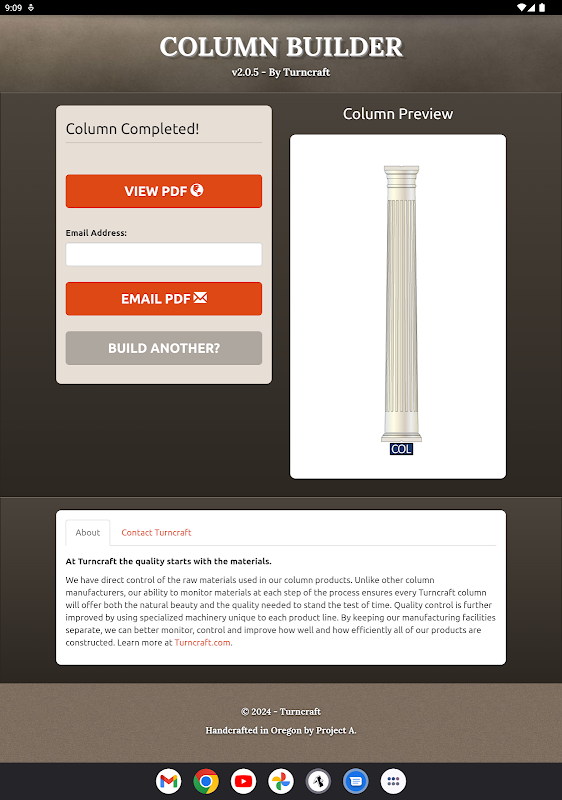 ٹرن کرافٹ کالم بلڈر ایپ کو یہ دیکھنے کے لیے چلائیں کہ کون سے اختیارات دستیاب ہیں اور ایک تصریح دستاویز تیار کریں جسے آپ اپنے مقامی ٹرن کرافٹ ڈیلر کے پاس اقتباس کے لیے لے جا سکتے ہیں۔