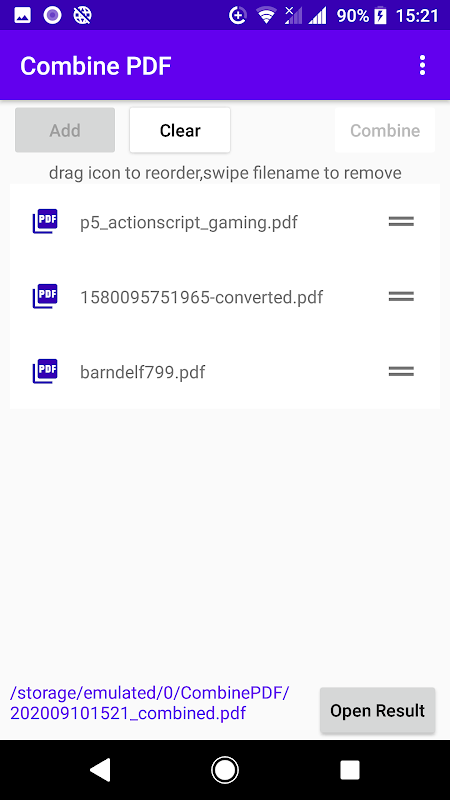 2.You can reorder PDF files with drag icon and you can remove PDF files with swipe to right
