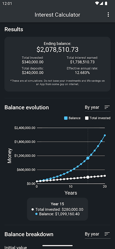 "بنیادی موڈ" کے ساتھ شروع کرنا آسان ہے: صرف ابتدائی رقم (اگر کوئی ہے)، ایک اختیاری ماہانہ ڈپازٹ، سود کی شرح اور کتنا وقت آپ اپنے سرمائے کو لگانے کی منصوبہ بندی کر رہے ہیں درج کریں۔ اس کے بعد یہ ایپ آپ کو وہ تمام معلومات دکھائے گی جس کی آپ کو ضرورت ہے ایک خوبصورت گراف میں، اس کے ساتھ منتخب مدت کے لیے تفصیلی تجزیہ بھی ہوگا۔