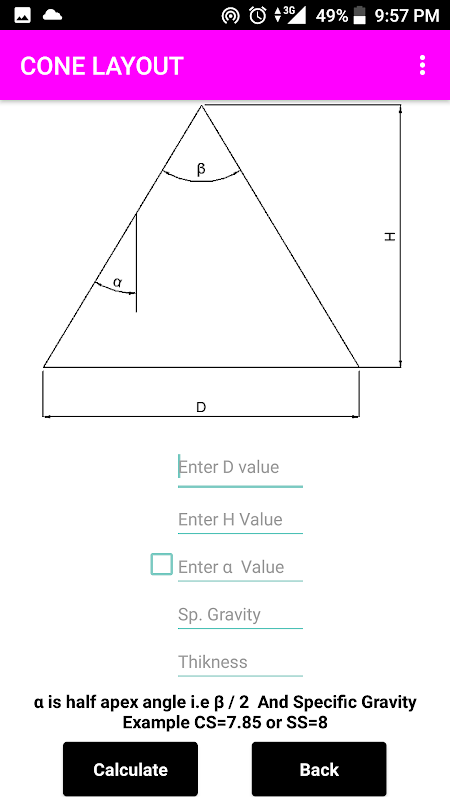 This app is give output as development radius, development angle, cord length, weight of Cone Blank and Plate size required for Cone.