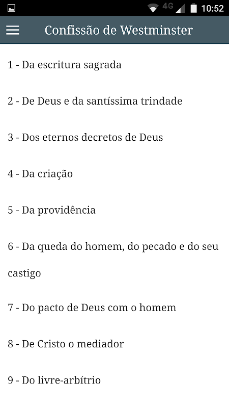 O aplicativo CONFE é uma biblioteca de confissões, credos e documentos da teologia reformada, ou seja, influenciados pela reforma protestante que se iniciou com Martinho Lutero em 1517.