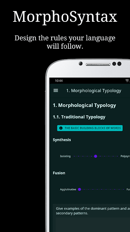MorphoSyntax: Conlang کی عمومی شکل اور نحو قائم کرنے کے لیے ایک آؤٹ لائن فارمیٹ گائیڈ۔ الفاظ ، جملے اور جملے بننے کے طریقے کی منصوبہ بندی کریں۔ ایک خاکہ بنائیں اور اسے ٹیکسٹ دستاویز میں برآمد کریں۔