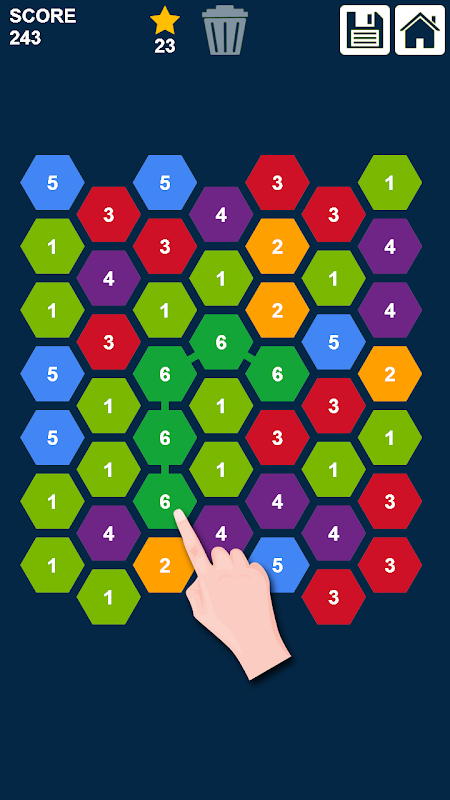 Hexagons puzzle: connect and merge numbers is a match-3 hexa numbers game. Just connect 3 or more same numbers then they will be merged into the next higher number. It is a relaxing and brain training hexa numbers puzzle.