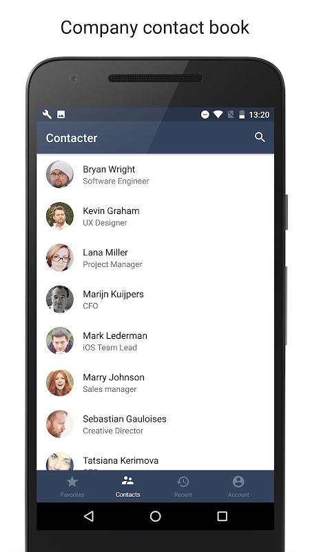 Contacter — private contact book of your company. Up-to-date staff contacts are just a touch away. Phone numbers, names, positions, emails — everything you need is now in your pocket.