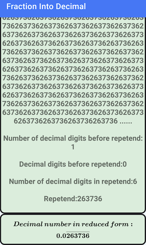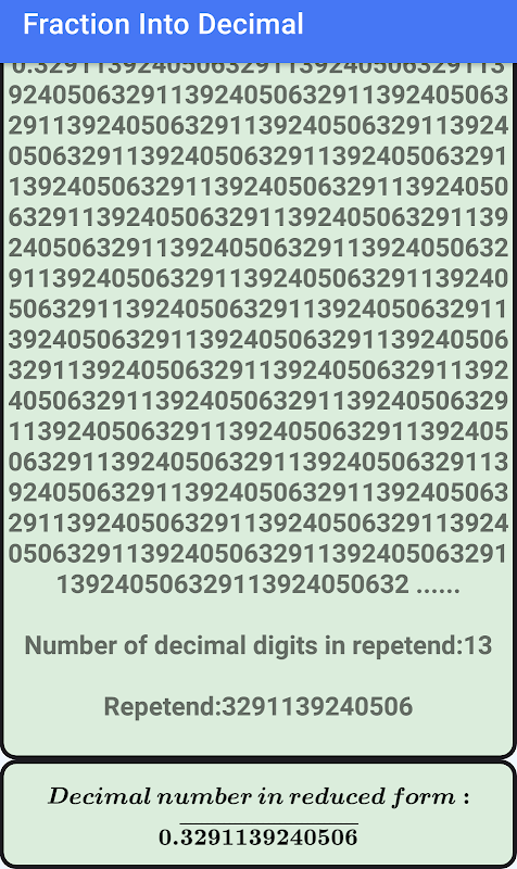 ایپ اعشاریہ کی قسم بھی دکھاتی ہے: عین اعشاریہ، خالص دہرانے والا اعشاریہ یا مخلوط دہرایا جانے والا اعشاریہ۔