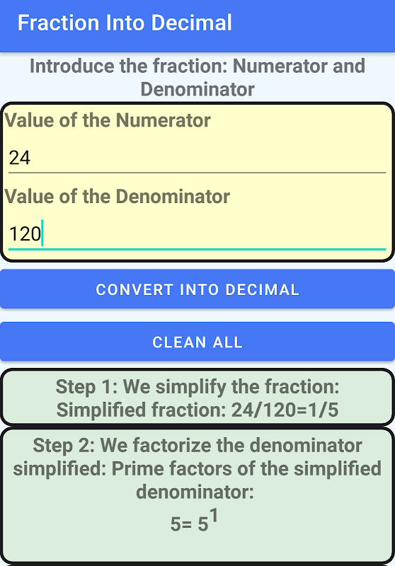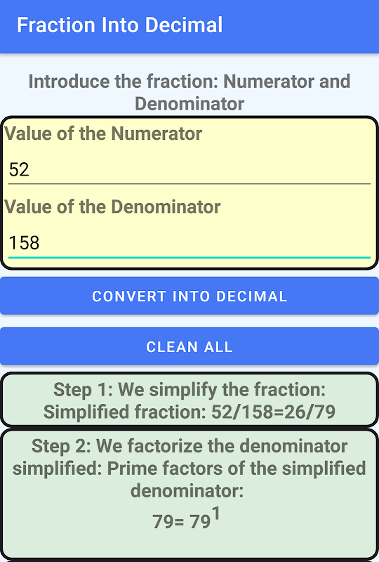 خلاصہ یہ ہے کہ صارف کو کسر کا عدد اور ڈینومینیٹر متعارف کرانا ہوگا اور ایپ درج ذیل مراحل پر عمل کرتی ہے: