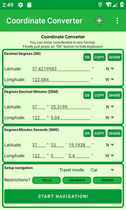 Bonus: This app will also allow you to launch the navigator Google Maps from coordinates. You will be able to setup navigation with typical options.
