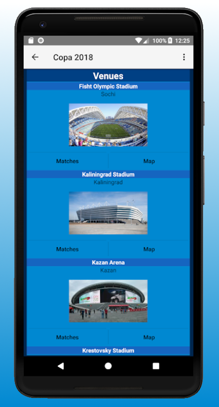 - All venues with names, cities, matches and integrated posiotioning with the maps app, and all beautiful flags of the countries;