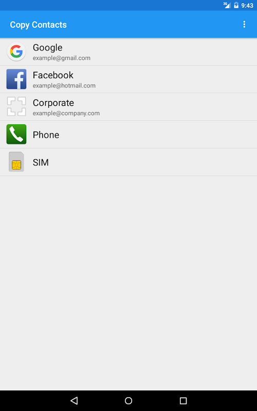 Copy or move your contacts from one account to another. For example: from SIM card or phone to Google, from Facebook* to your Corporate (Exchange), from Google to SIM, ...etc.