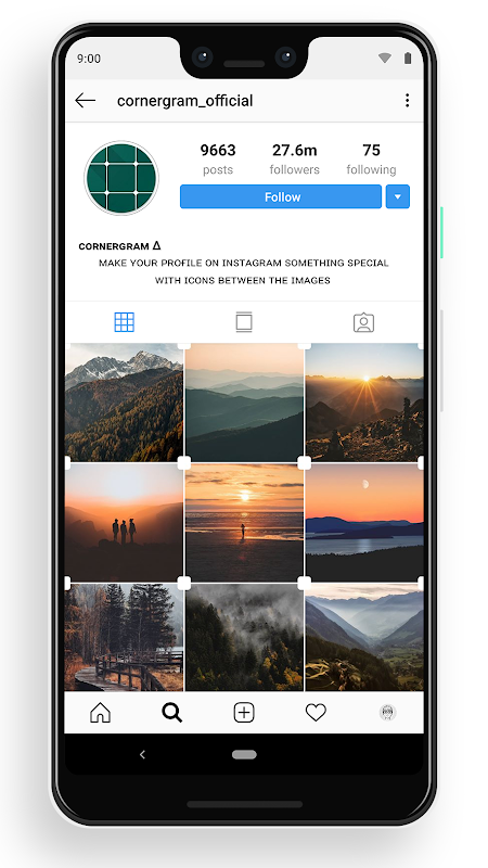Cornergram is an app that allows you to edit images so that Instagram shows icons (e.g. a circle, a heart or a diamond) in the profile view between the individual photos. In this way you can creatively use the otherwise useless space between the images. For this to work, you must of course apply the same symbol to several images and then upload them.