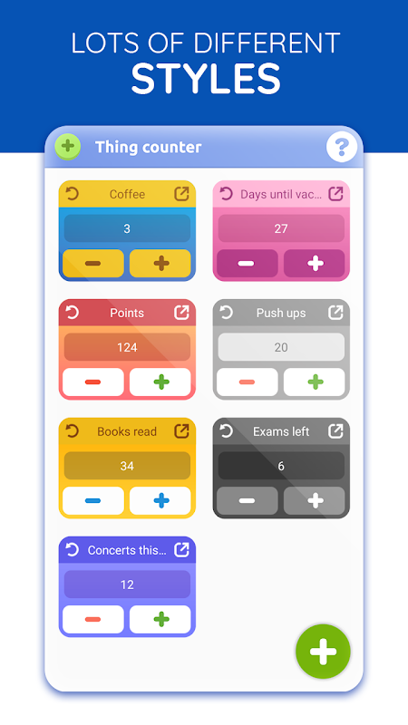Counting has never been easier. Now you can have a special counting tool – clicker counter with tally counter. This thing counter is a widget maker app. That means you can create a widget to make your counting fast and simple. You can add an item in just a few steps - add title, choose skin and if you want place your widget on Home screen. You can edit your widget anytime, just go to the app settings and rename its title or choose another skin. User friendly app, nice interface, all the options you need for counting, without useless buttons. Now you can easily count whatever you want. Keep track of everything that is important to you. With this free tool you can count clicks like a tally counter. Count kisses, steps, pages, stars, drinks, whatever you want with this Count on me – Thing Counter Widget.