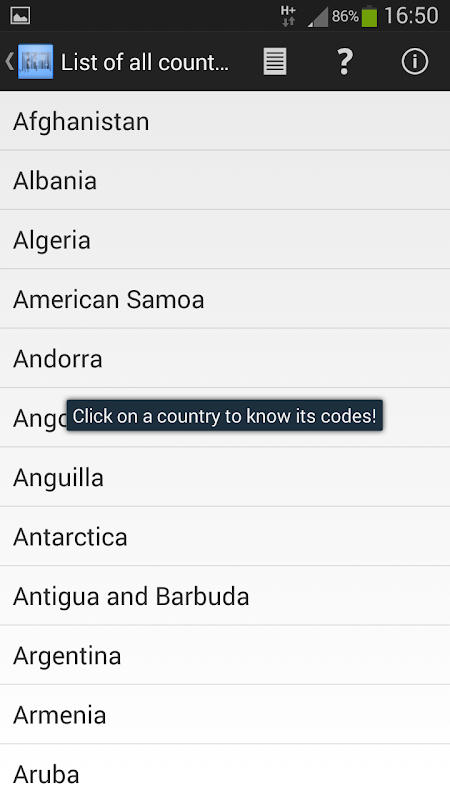 This is a very simple app that can be used to find the country that corresponds to a certain code. This app handles the following country codes: