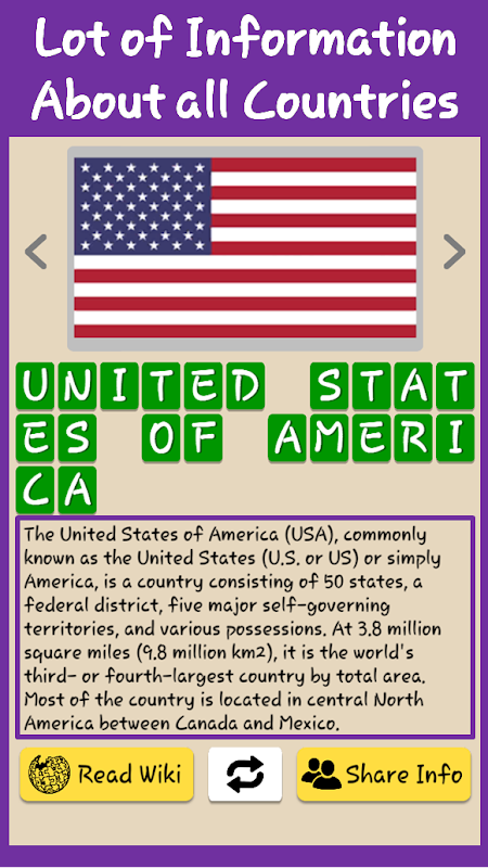 Have unlimited fun and learning with this amazing flags and maps quiz game.