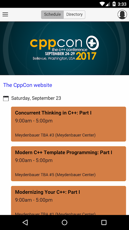 Browse the entire schedule for CppCon 2017. You can filter by color-coded types, venues or search for what you need. Get the full details of every event without having to crack open an event guide.