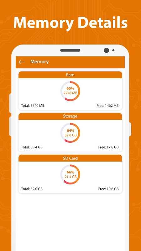 – Memory: Total and available RAM, as well as Storage information about your device.