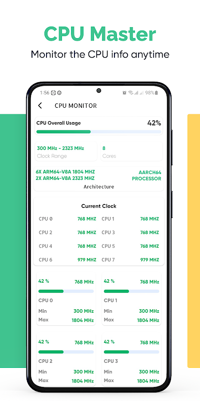 سی پی یو مانیٹر - فون کلینر اینڈرائیڈ کے لیے ایک طاقتور ایپ ہے۔ یہ حقیقی وقت میں ڈیوائس CPU کے استعمال کی نگرانی کر سکتا ہے، CPU درجہ حرارت، بیٹری کا درجہ حرارت (فون یا CPU کا تخمینہ درجہ حرارت) مانیٹر کر سکتا ہے۔ سی پی یو ماسٹر فائل کلینر، بیٹری مانیٹر سمیت دیگر افعال بھی فراہم کرتا ہے۔