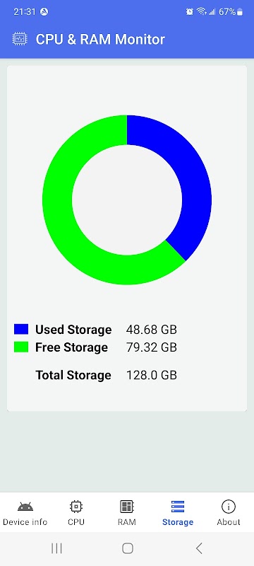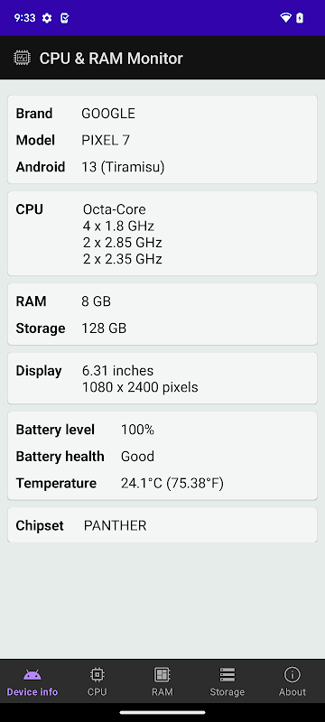 - ڈیوائس کی معلومات (برانڈ، ماڈل، سی پی یو، رام، اسٹوریج، ڈسپلے، بیٹری کی صحت اور درجہ حرارت، چپ سیٹ)،