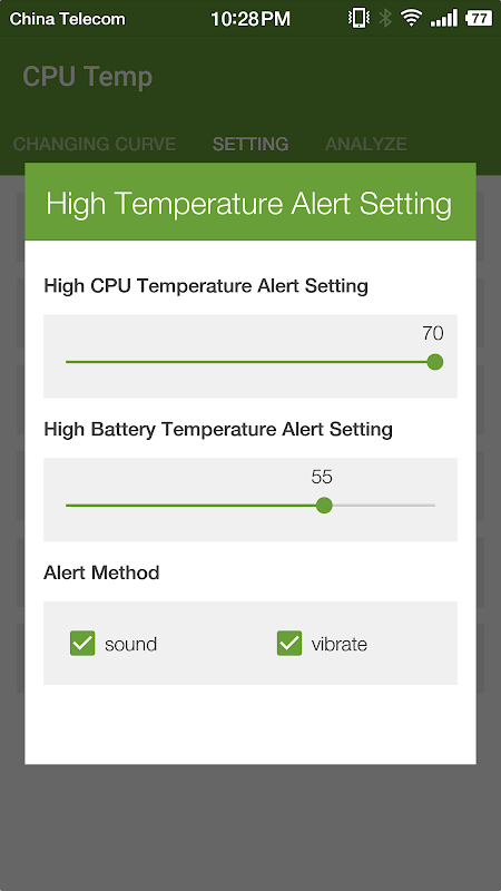 Cpu Temperature will trigger an alarm when cpu's or battery's temperature is over heat, you can set the alarm temperature and choose on/off the over heat alarm as your like.