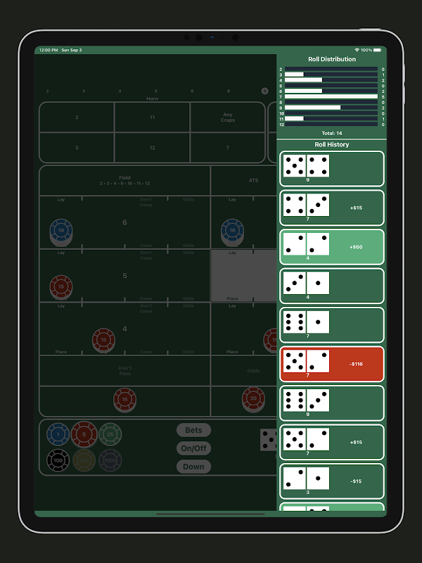 سنگل پلیئر سمیلیٹڈ گیم کے ساتھ کریپس کی دنیا میں قدم رکھیں۔ ڈائس کو رول کریں، شرط لگائیں، اور اپنی رول ہسٹری کو ٹریک کریں کیونکہ آپ اپنے آلے پر ہی کریپس کے تجربے سے لطف اندوز ہوتے ہیں۔