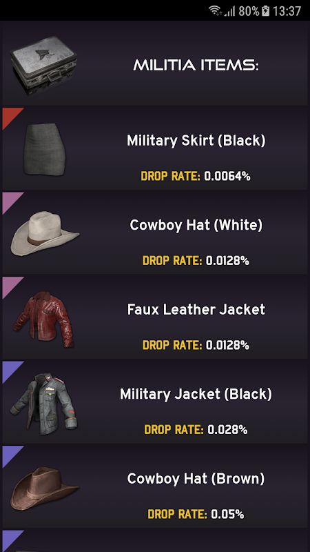 Crate Simulator for PUBG contains all the available clothes crates from the real game: FEVER, MILITIA, DESPERADO, BIKER, SURVIVOR, WANDERER, GAMESCOM, TRIUMPH, RAIDER and EQUINOX. In this simulator, all of them are free to open and displays you the price of the dropped item and its drop rate!