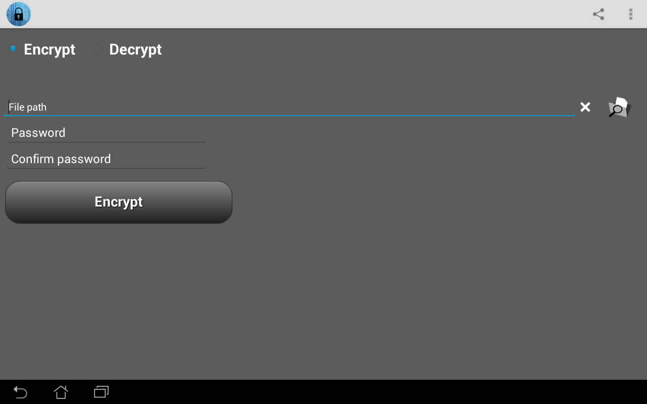 This application is used for encrypting and decrypting files with 256 bit AES algorithm. You can use it to encrypt files before putting them on online locations (cloud storage, Google Drive, Skydrive, Box, Dropbox, Gmail, etc.) or to store encrypted sensitive files on your Android phone so that they are unreadable to those who don't know your password.
