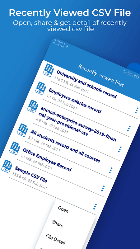 CSV فائل دیکھنے والا آپ کو CSV فائل پرنٹ کرنے کی اجازت دے گا اور پی ڈی ایف فائلوں کو آسانی سے پرنٹ بھی کرسکتا ہے۔ CSV فائل ریڈر کے ذریعہ آپ کسی بھی CSV فائل کو ڈیوائس اسٹوریج سے منتخب کرسکتے ہیں اور اسے ٹیبلر شکل میں دیکھ سکتے ہیں۔ اس کے بعد آپ فونٹ کا سائز ، متن کا رنگ ، ٹیبل پس منظر کا رنگ ، فونٹ فیملی اور بہت کچھ تبدیل کرکے اپنی ضرورت کے مطابق ٹیبل کو اپنی مرضی کے مطابق کرسکتے ہیں۔