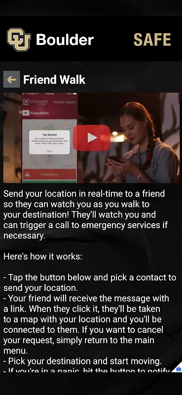 - مانیٹر شدہ واکس: کسی بھروسہ مند رابطہ کو اپنے سفر کو ٹریک کرنے دینے کے لیے فرینڈ واک کا استعمال کریں، یا CU بولڈر پولیس کے ذریعے ریئل ٹائم مانیٹرنگ کے لیے ورچوئل واک ہوم کی درخواست کریں۔
