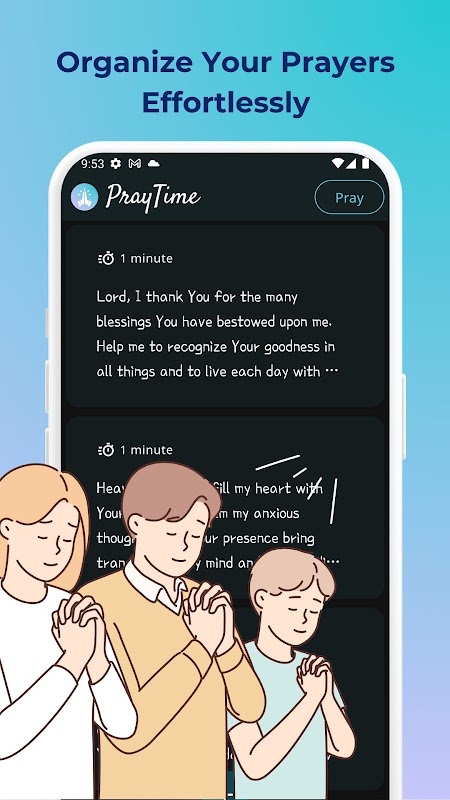 PrayTime ایک ہمہ جہت نماز کا انتظام کرنے والی ایپ ہے جو آپ کے نماز کے تجربے کو بڑھانے کے لیے بنائی گئی ہے۔ نماز کے وقت کے ساتھ، آپ آسانی سے اپنی نمازوں کا نظم کر سکتے ہیں، ہر نماز کے موضوع کے لیے مخصوص اوقات مقرر کر سکتے ہیں، اور نماز کا ایک ذاتی معمول بنا سکتے ہیں۔ ایپ ایک انوکھی خصوصیت بھی پیش کرتی ہے جو آپ کو نماز کے دوران اپنی پسند کی پرسکون موسیقی بجانے کی اجازت دیتی ہے، ایک پرسکون اور مرکوز ماحول بناتی ہے۔