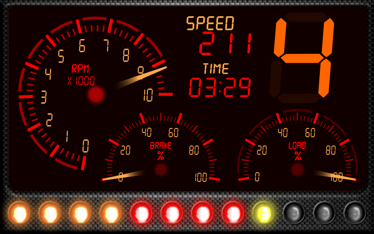 - تھروٹل/بریک پوزیشن ، RPM اور ٹربو بوسٹ (صرف RBR) ظاہر کرنے کے لیے دو اضافی ایل ای ڈی بار دستیاب ہیں۔