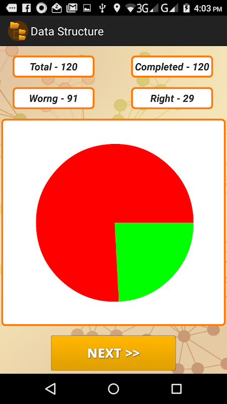 At the end of session , it displays the results with a PIE graph. You can share this result with your friends. If you want to learn more about the subject, the App also has tutorials for FREE. This is a comprehensive tool that prepares you for the Data Structure Exam.