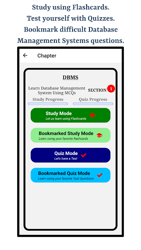 یہ ایپ ڈیٹا بیس مینجمنٹ سسٹمز کے بارے میں جاننے کا ایک بہترین ذریعہ ہے۔ ایپ کو بہت کم وقت کے لیے مطالعہ کرکے صارفین کو ڈیٹا بیس مینجمنٹ سسٹمز کے عمومی سوالات کو مکمل طور پر سمجھنے کے لیے بنایا گیا ہے۔ آڈیو فعالیت اور بک مارکنگ پوری ایپ میں باب، سیکشن، اسٹڈی موڈ اور کوئز موڈز پر دستیاب ہے۔