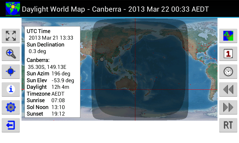 دکھاتا ہے کہ دنیا کے کون سے حصے دن کی روشنی میں ہیں، کون سے گودھولی میں ہیں، اور کون سے اندھیرے میں ہیں۔ سورج اور چاند کی تخمینی پوزیشنیں (زمین پر متوقع) بھی دکھائی گئی ہیں۔
